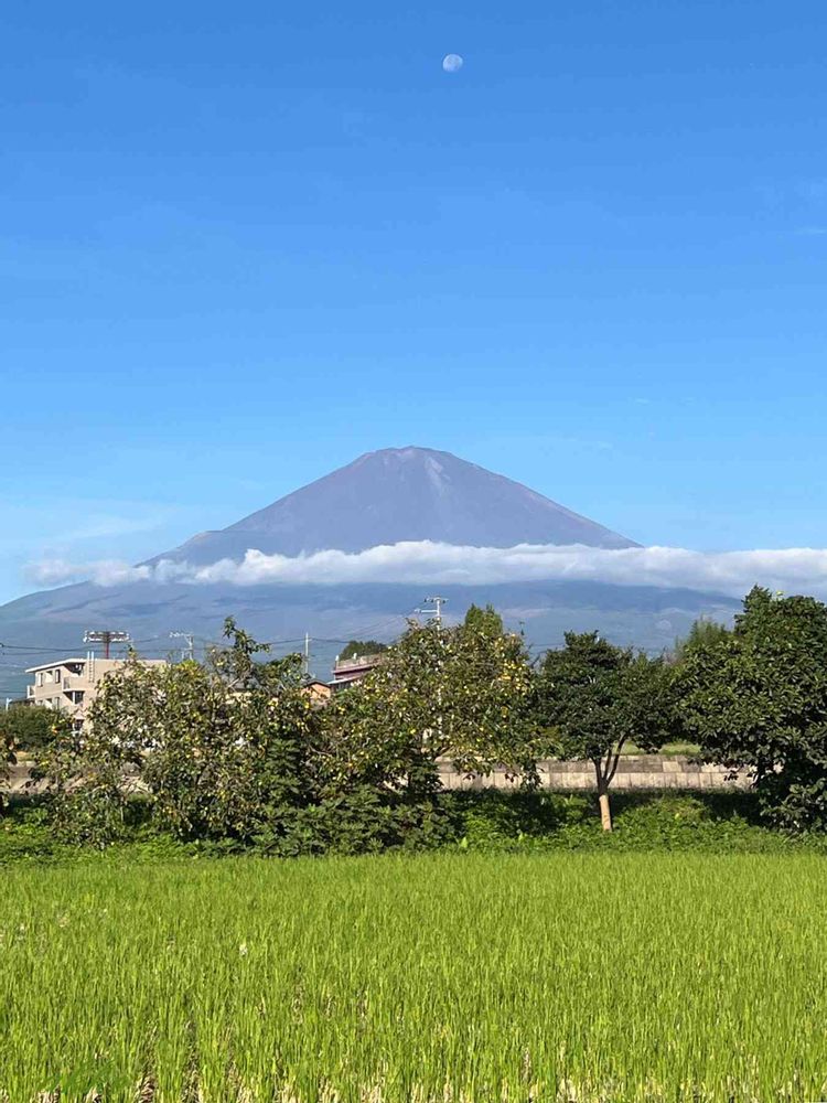 気持ちのいい富士山にお月様や稲刈り後のみどり 爽やかでとても綺麗ですね😃👍