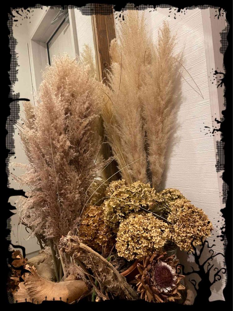 パンパスグラスやアナベルアーティーチョークのドライに枯れたコウモリラン