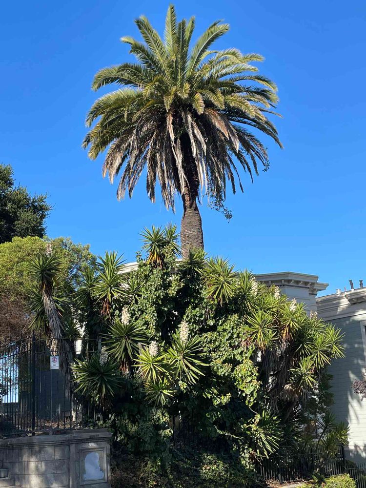 このヤシと後別の投稿のヤシは葉が綺麗な羽状かつ巨木なので近縁のカナリーヤシになります( ^ω^ )気になりましたのでヤシ警察的お節介コメント失礼致しますm(__)m