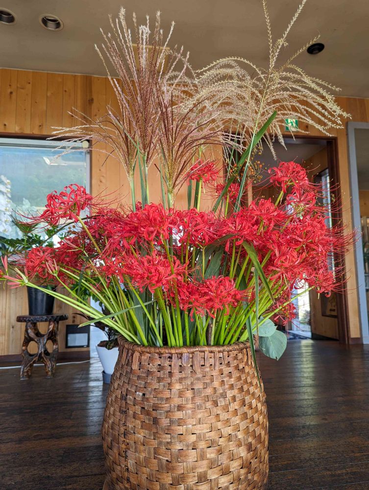 度々訪れる海沿いのカフェですが いつもお花を飾っていて 今回の様なススキとヒガンバナを籠生けしているのは初めて見ました😄