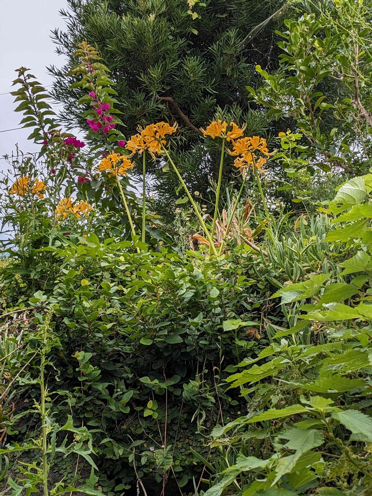 畑の花々。雑草払いをしてますが、そこまでまだたどり着いていません。途中まで入っていけます。😂