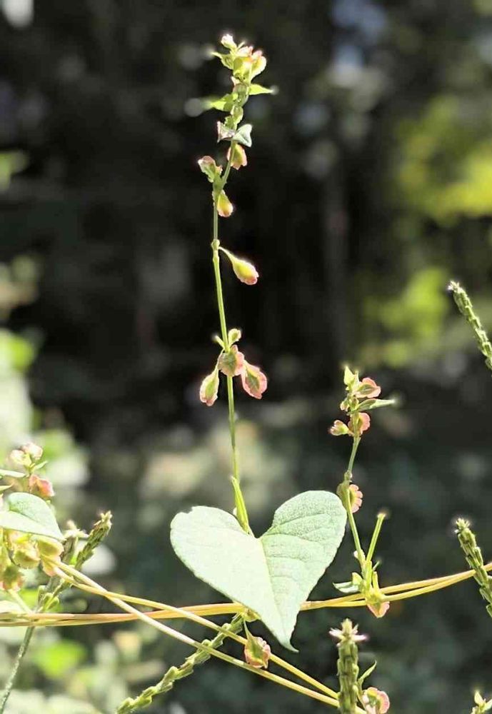 いつもの野生の紫の朝顔を見に行く場所 やはり蔓性のようで近くの葉っぱも朝顔の葉ですので戸惑いました 一緒に沢山生えているヒナタイノコヅチの何かでも無さそうだし 色々調べるうち これオオツルイタドリ?…に辿り着きました