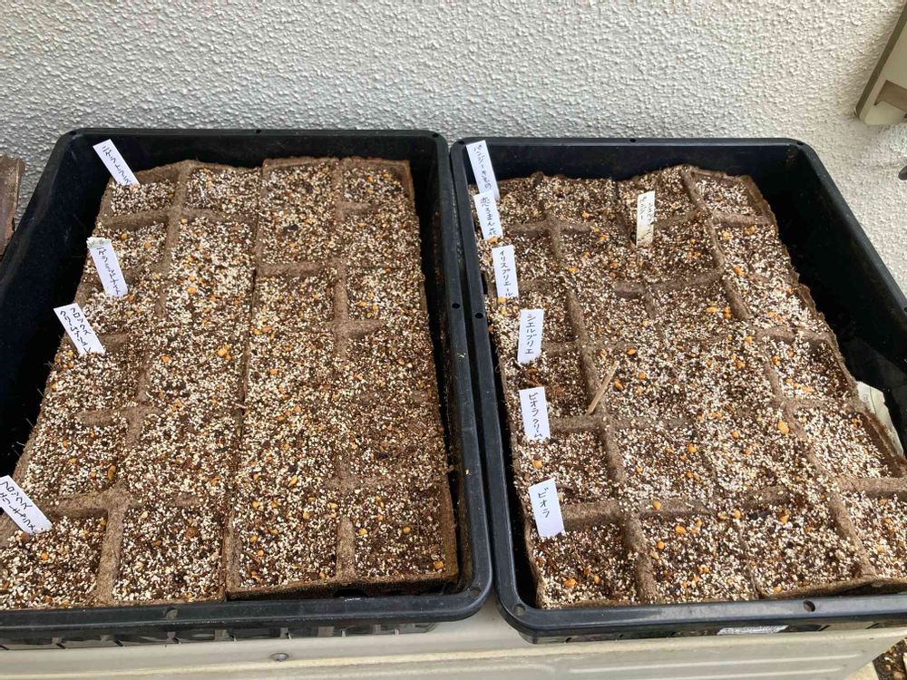 右側はパンジー、ビオラの自家採取の育苗ポットの様子です