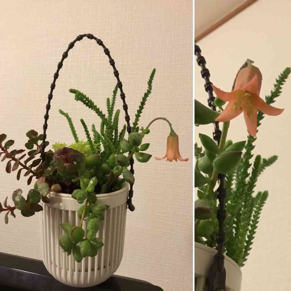 すぐ、見よう見まねで寄せ植えしてみた子達。コチレドンペンデンスに蕾ができてから随分日がたちました。数日前から花芽の色が変わってきたので、咲かないまま終わりかなあ〜…と諦め掛けていました😔今日は朝から出かけていて、先程帰宅し早速ベランダのパトロールに向かったところ🙂😀😃👏👍🎊🎉💕💓💘お花が咲いていましたあ〜🎶