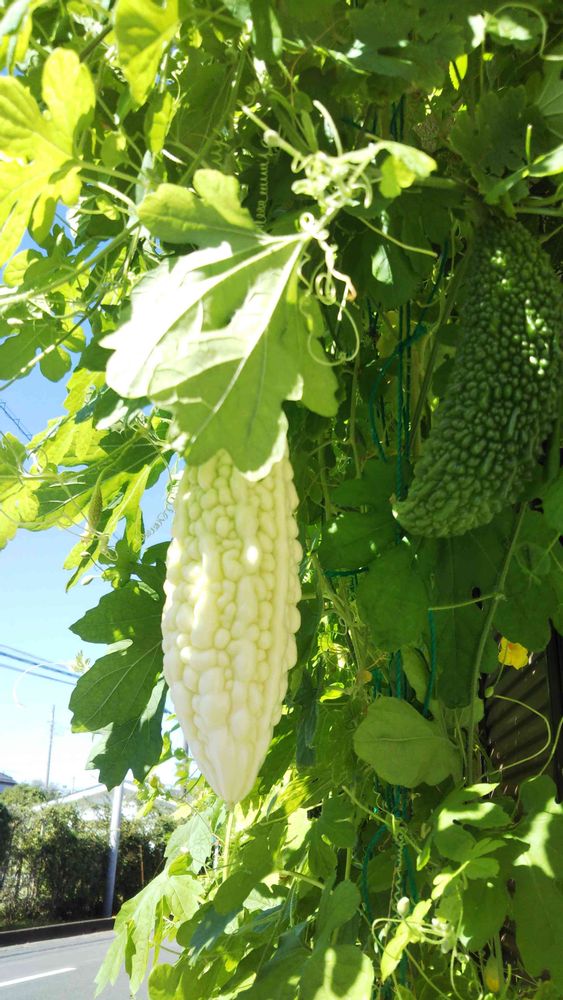 我が家のグリーンカーテンに季節外れのゴーヤ(白と緑)がなっています。