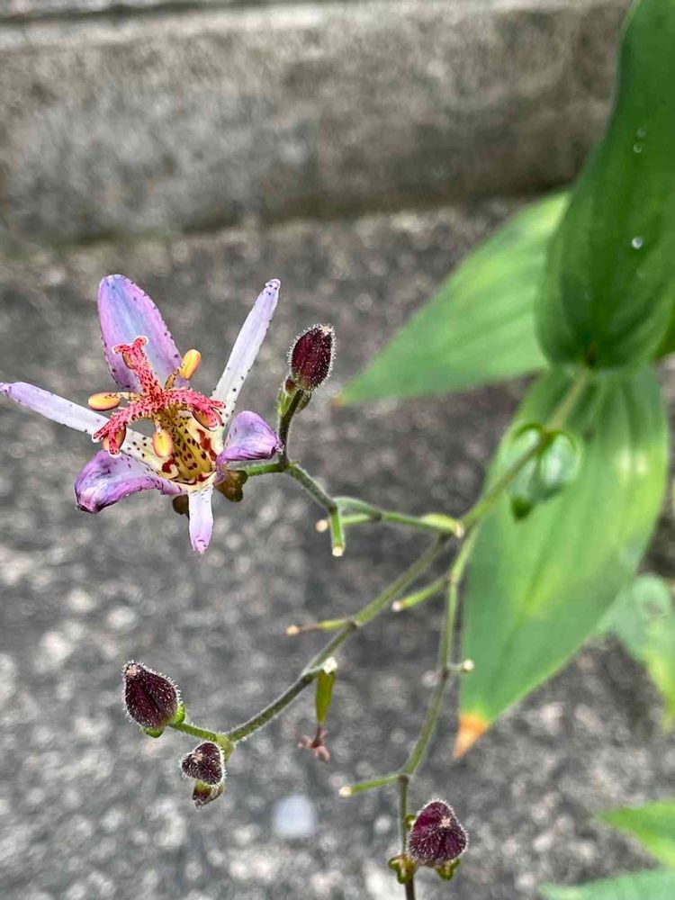 私の家の裏に、去年も咲いていたので覗いてみると、コンクリートの1cmもない隙間から何本か生えていました。ユリ科ホトトギス属。花が茎先に散房状に咲くそうです。去年より増えています。