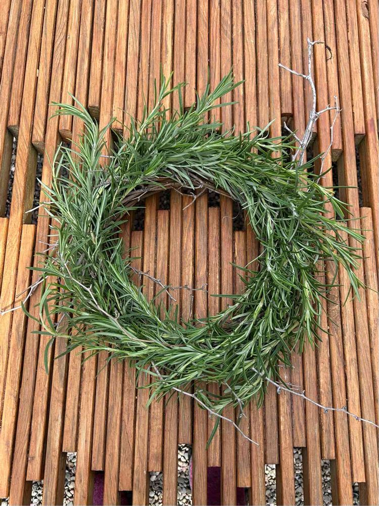 庭で育てたローズマリーでリースを作りました。ベースはブドウ蔓です。
