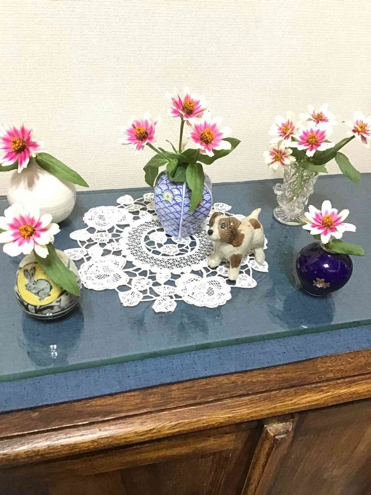 今 やっと 花盛り🌸 小さいジニアさん🌸なので、 滅多に 使わない豆花瓶の 勢揃いです〜❗️