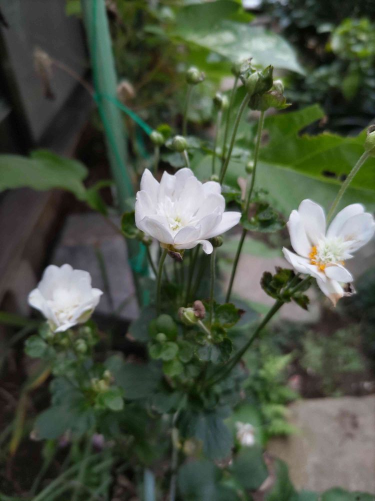 ちょっと変わったシュウメイギク…八重で黄色い蕊のところにも白いものが…イチゲのような咲き方
