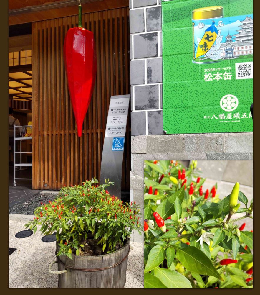 長野では有名な七味唐辛子のお店の入口にあった、大きなトウガラシのお店のオブジェと、小さなトウガラシの鉢植えです。