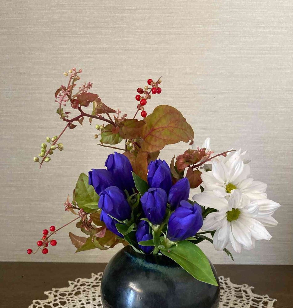 とっても素敵な竜胆でしたので、お庭のジュズサンゴと菊を合わせてみたんですよ☆彡