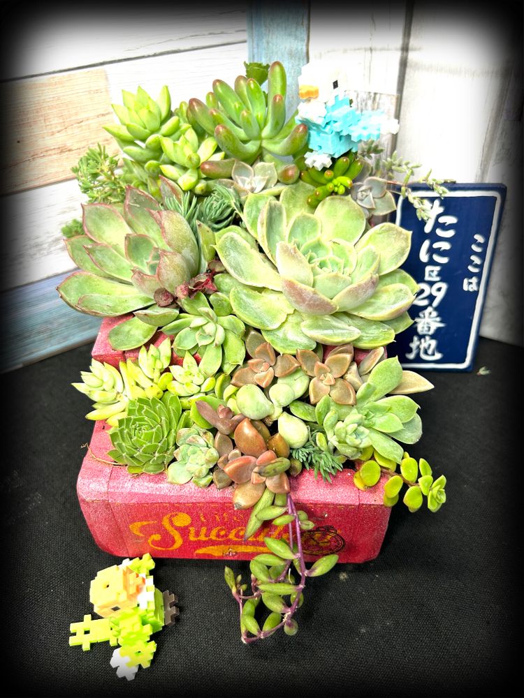 gen genさんの木製鉢に、今いる子を集めてみました。🟥の多肉も🟨の多肉も無くて寂しいねーꉂꉂ(ˊᗜˋ)笑