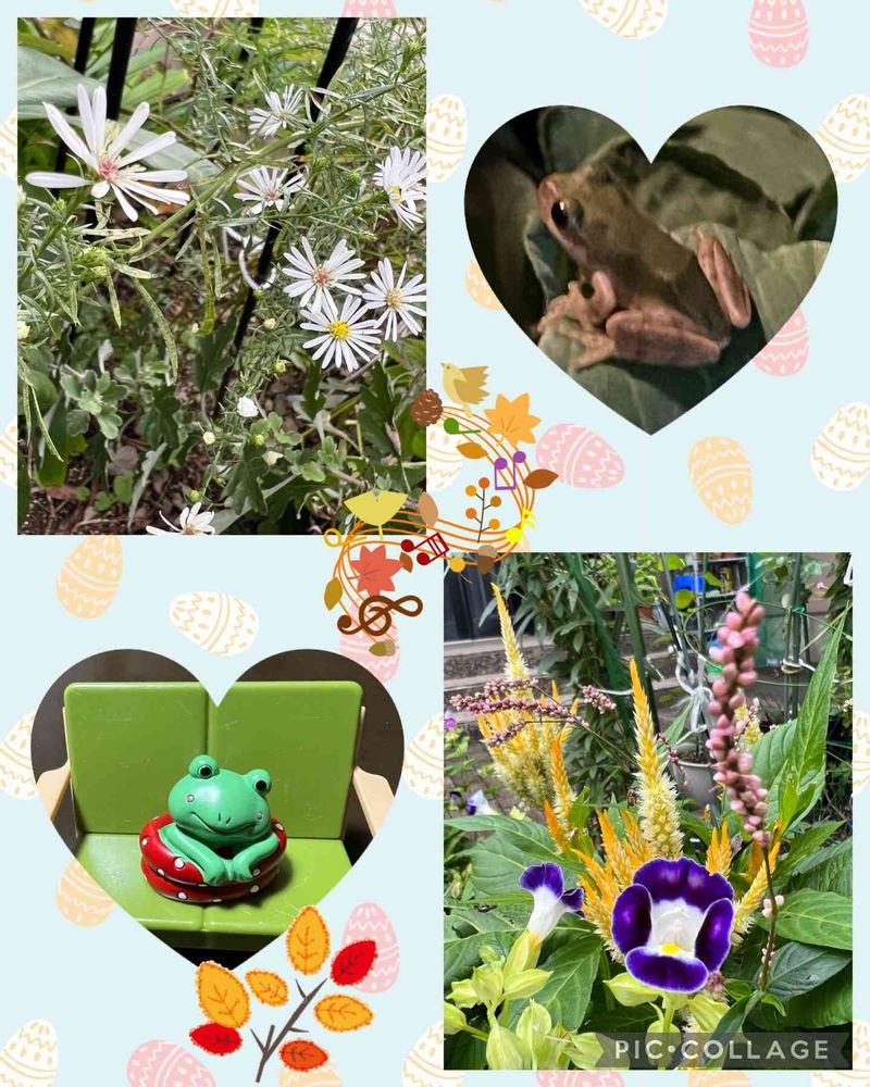 クジャクアスター・イヌタデ・ケイト・トレニア…葉牡丹の上にいつも居てるアマガエル🍀*゜
