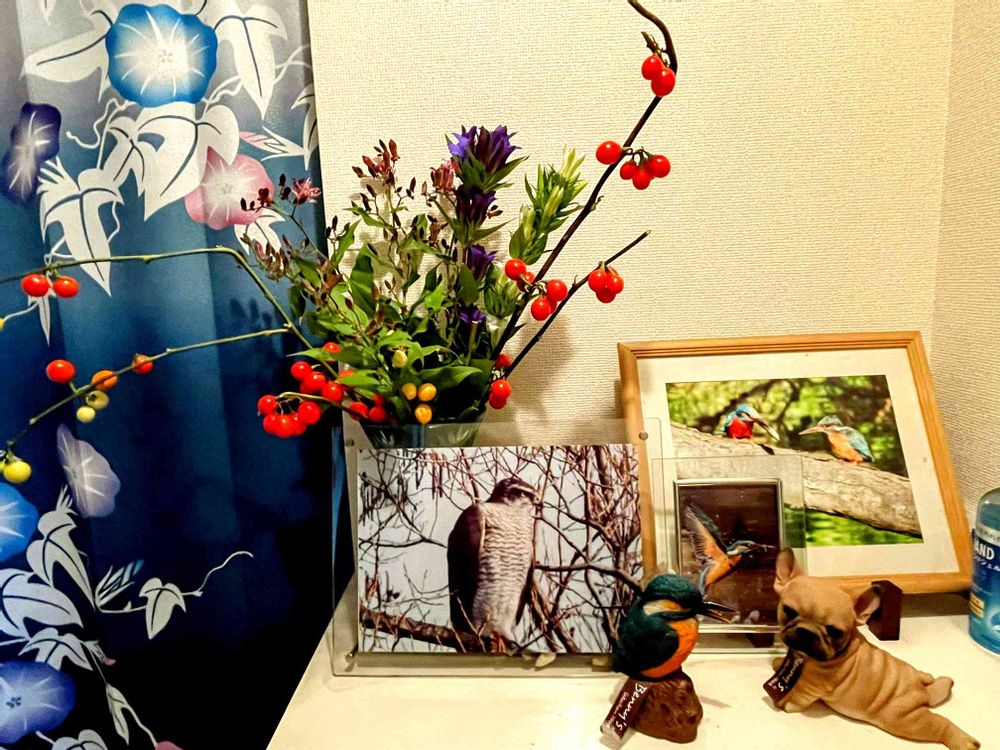 m&oさんの我が家の下駄箱の上,お花は、竜胆、ホトトギス、花ナス,オオタカとカワセミの写真の投稿画像