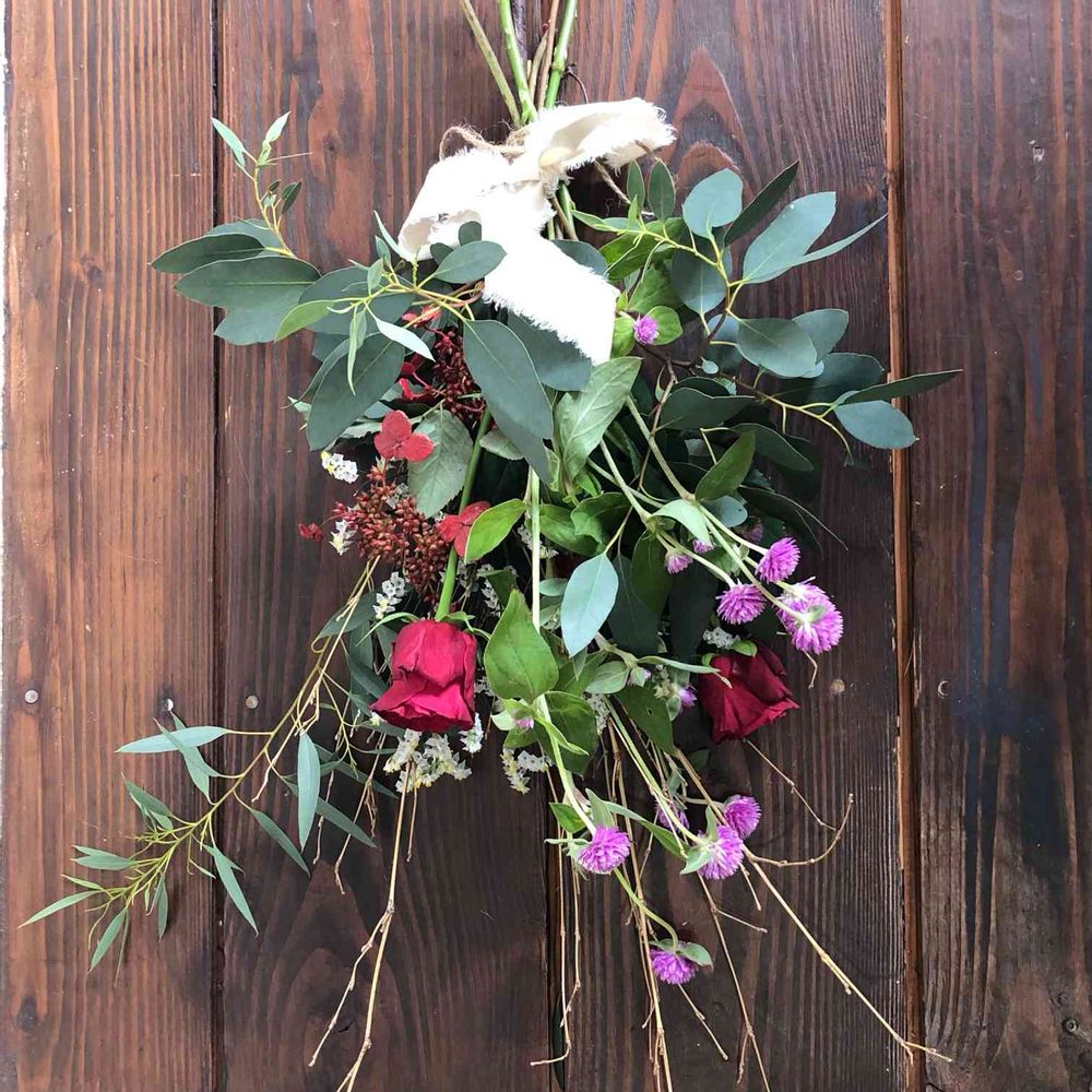 上に千日紅、バラ、ユーカリをバサっと重ねて。
