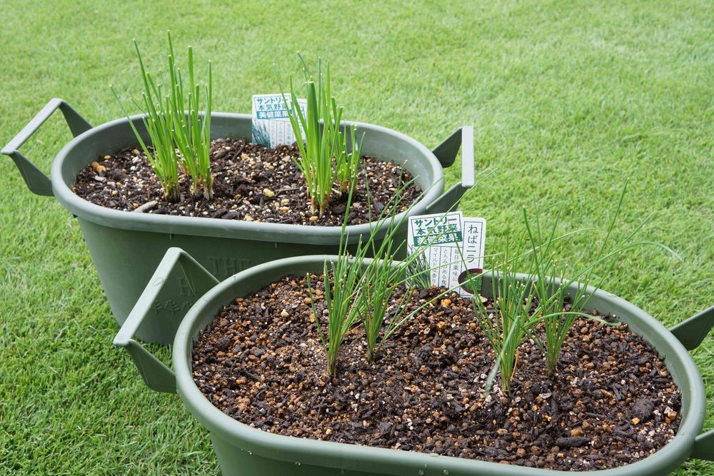 春から育てているねばニラは(奥)5回目の収穫に向けて生長中。