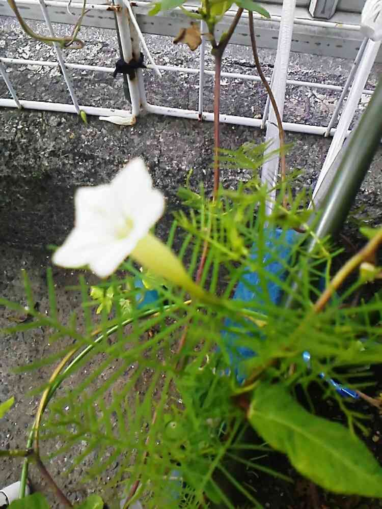 こんばんは 赤色のは先に別の場所で咲いてました が白色が普通の朝顔と一緒に発芽していたので やっと遅れて咲いたのです。