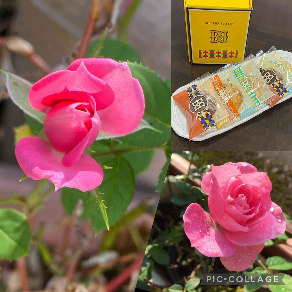 ☘️ミニばら☘️.....昨日の雨が効いてかわいさ満点で開きはじめたよ✨💕🌸💕✨クッキー🍪は[バターステイツby銀のぶどう]。お友達からのおみやげ🎁。パッケージもカッコイイし、何よりバターの香りがこうばしくザクザク感がたまらないよ〜😋👍🫧🫧