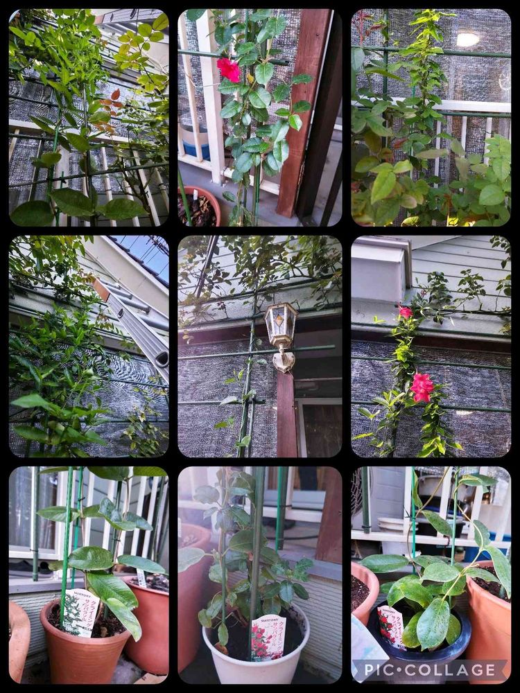 これら3鉢は、クレマチスのようにつるバラに絡ませようと思って、ブッシュローズを置いている南側のバルコニーに置き、のびたつるを支柱フェンスに絡ませています。