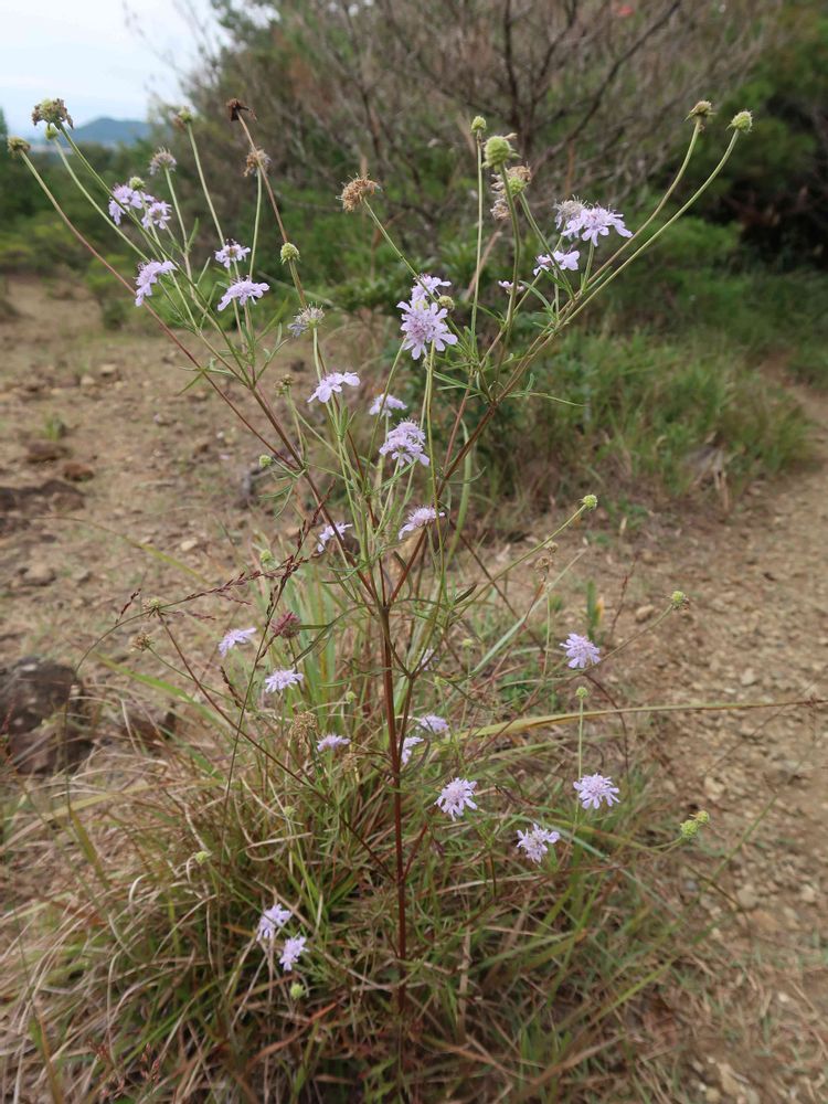 地元の低山で咲いている、ミカワマツムシソウ。マツムシソウの蛇紋岩地帯の変種です。以前も紹介していますが再度説明、普通のマツムシソウに比べ舌状花はないか少ない、頭花も小さい。この種を植えても特徴を持った花が咲きます。これも見たとおり、こんな荒れ地で咲きます。✌️😀🐶