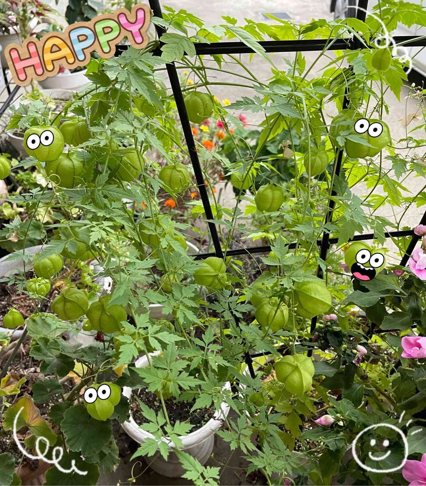 玄関出ると〜左手に見えますのはフウセンカズラさん💚😆♬
