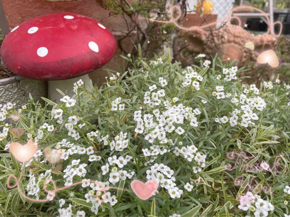 アリッサムも可愛い😍し、赤いキノコ🍄も、可愛い〜。もう〜。見せ方が上手いね〜。