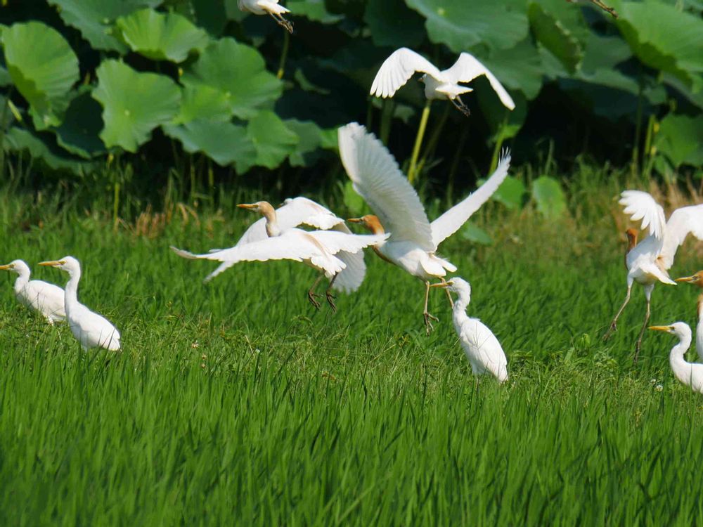 背景の蓮の青緑とアマサギの躍動感ある白い羽根、そこに差す亜麻色。