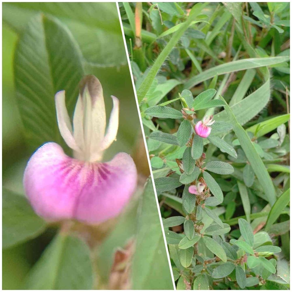 地面にへばり付くように広がっているのに出会う(^.^) ピンク色の旗弁の放射状の筋模様が蜜標だが、マルバヤハズソウだとこれが茶色を帯びている🟤