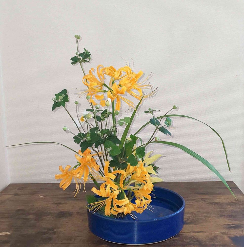 器の青によく合う黄色の曼珠沙華🟡がとても華やかでいいですね。