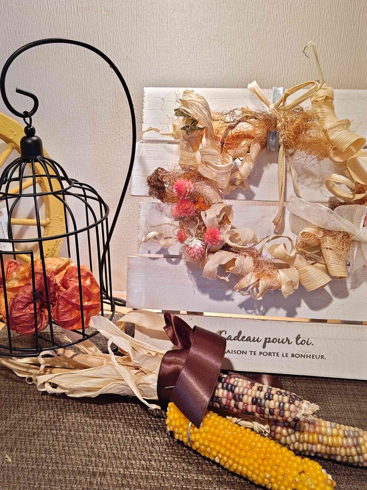 去年のトウモロコシ🌽の皮やヒゲで作ったリース、マリーゴールドの花を、千日紅🏵と交換。
