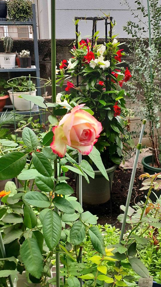 後ろにサンフラアンバサダーのクライミングサンパラソルの大輪ホワイトとレッドが居ますがそれが良い背景になってます😊