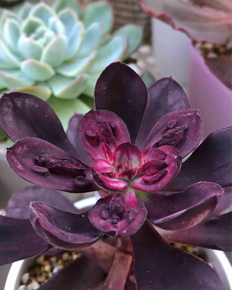 うちのはやや赤い部分が多めの株で、冬はこんな感じで赤黒くなるのだけど、今年は一段と色濃くなってるよ(茎まで赤黒くなってるよ😅)ちょっとは緑の部分も残ってて欲しかったんだけどね😅