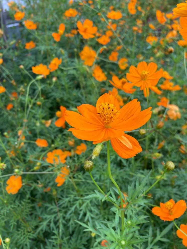 ご近所にある幼稚園の畑。数年前はほんの一角に咲いていただけだったけれど、いつの間にか、ぐるりと囲むように🧡キバナコスモス🧡が咲き乱れています😍