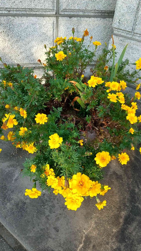 黄色いマリーゴールドの花が綺麗にたくさん咲いています。