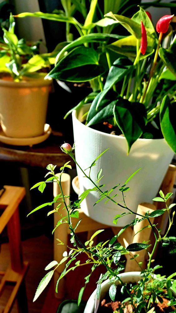 バラの乙女ちゃんも大きくなって、アンスリウムもつぼみいっぱいですね!