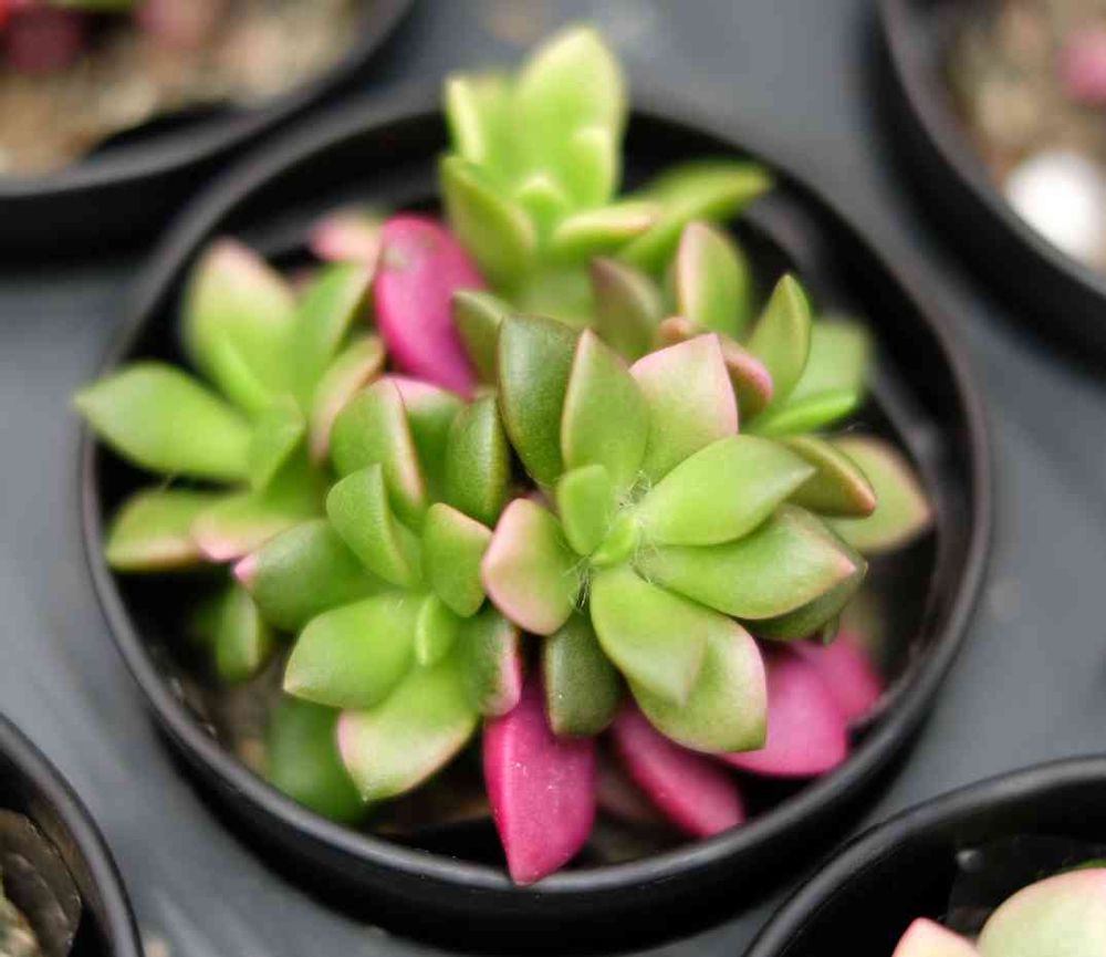 暑い季節は多肉植物!!なんとも可愛らしいピンクと黄緑の多肉ちゃん、アナカンプロセス桜吹雪(*^_^*)単体でも良いですし、紫の多肉植物と寄せ植えてもステキですね♪