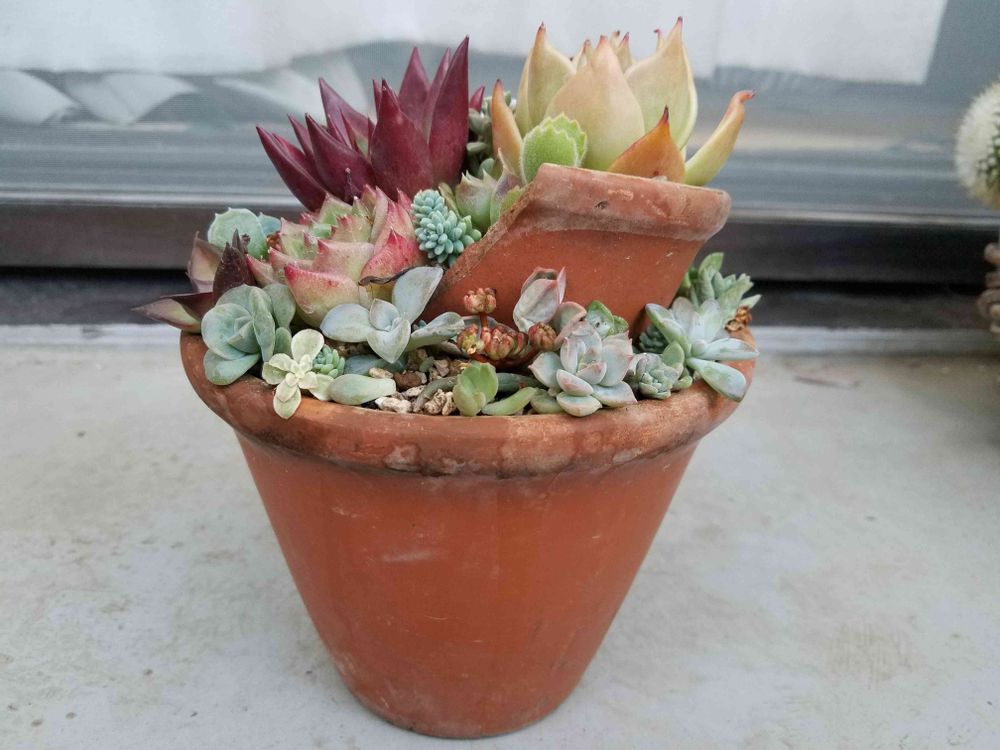 割れた鉢を重ねて2階建て寄せ植え作りました🎵