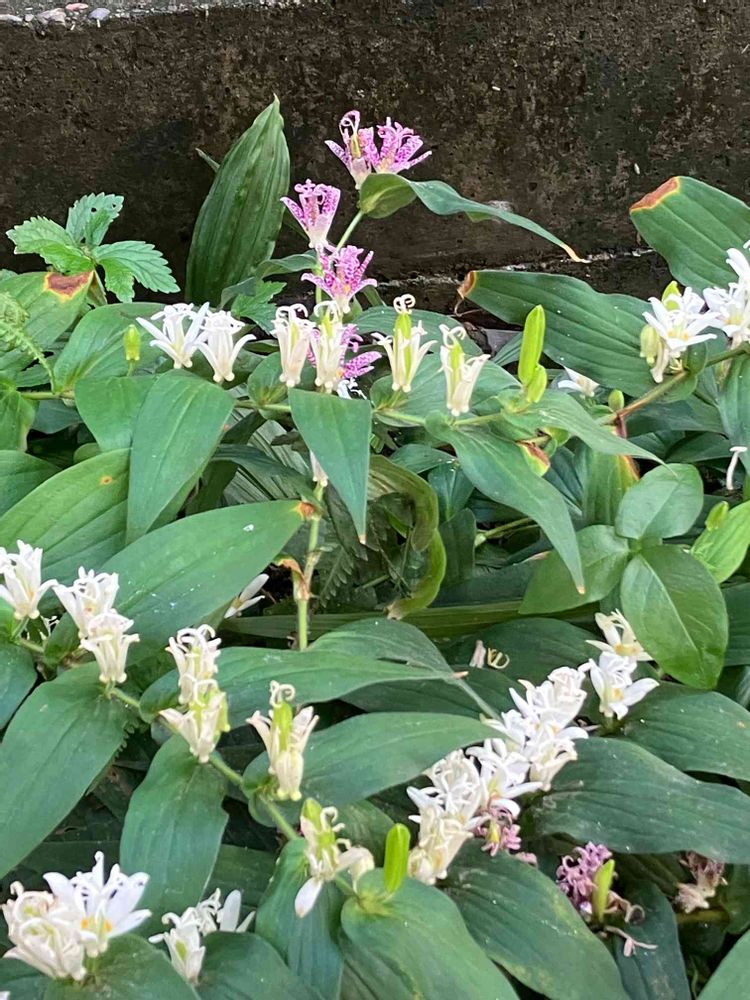 ホトトギス日陰の庭できれいに咲いています🤍💜