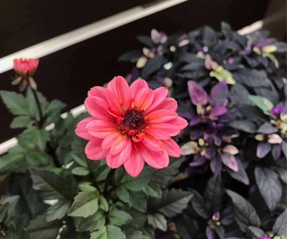 ダークリーフとサーモンピンクのお花がオシャレなプチダリア💕