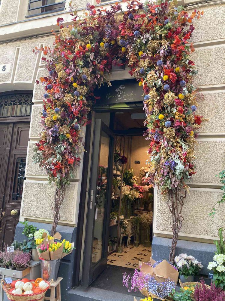 此方の生花店の特徴で、入口の上部に花が飾られている店が多いです。先日の国民の祝日の時に見つけて📸