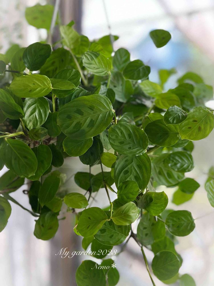 窓辺のグリーン🪴マランタ モンヨウショウ、まだら模様のグリーンの葉が綺麗です💕今窓辺で元気な植物です(*ˊᵕˋ*)੭