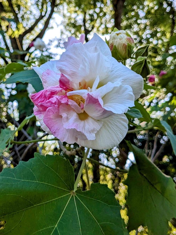 一本の木に赤や白が入り混じって咲いてるので不思議に思って調べたら一日で真っ白が真っ赤になるそうです❗