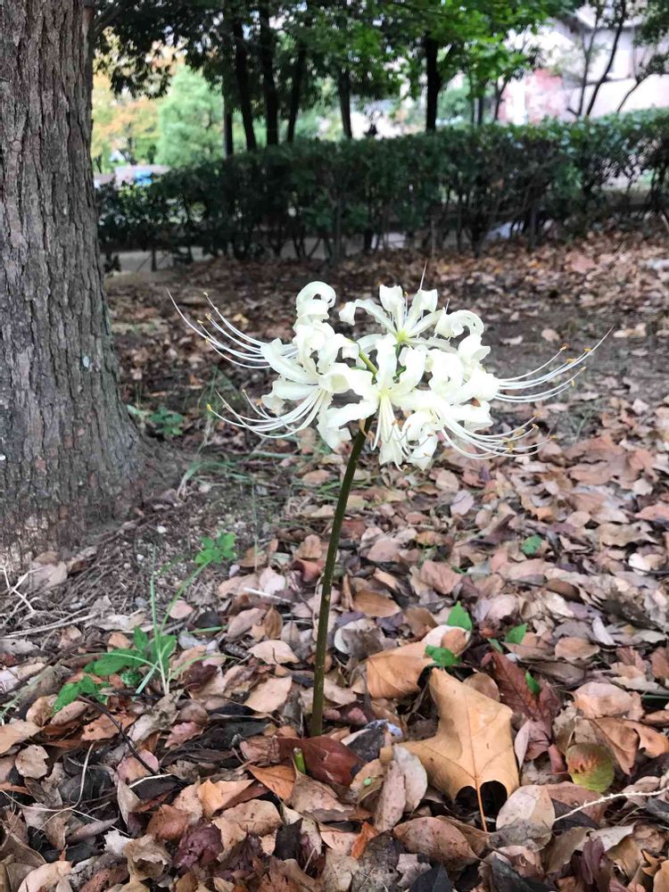 落ち葉を踏みながら歩いた先に白い彼岸花が咲いていました