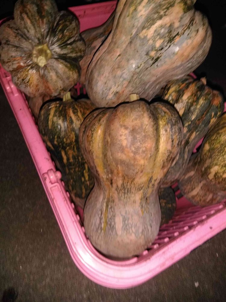 収穫はヒョウタンカボチャは一度で持てないのでバイクで2往復。