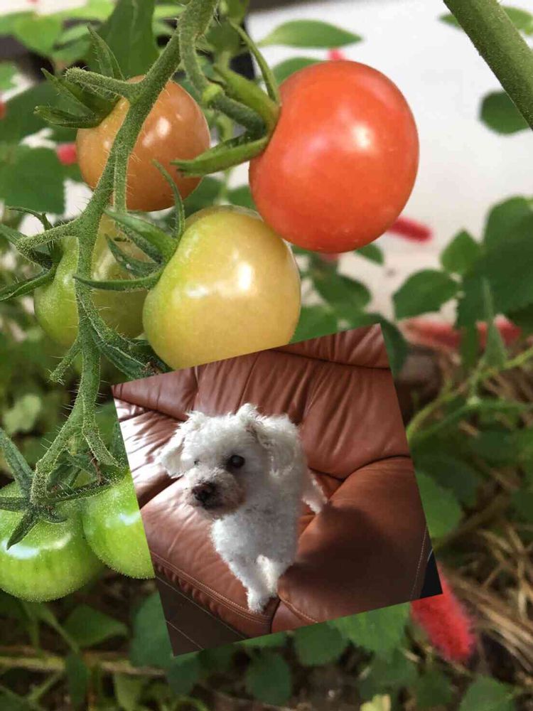 今朝庭にでて🍅食べてみたら美味しかったです💕🤗ベリーはおじいちゃんで16歳でよく寝ますよー🐶