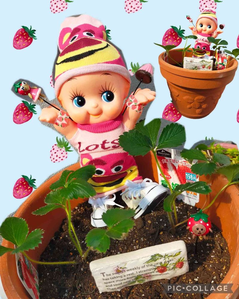 いちごさんに頂いた、可愛い🍓ちゃんピックとアポロピックを持って、デカキュピちゃんはごっつご機嫌🎶