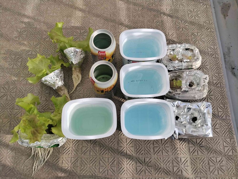 コーンスープの紙パックで包んでいた容器が一番藻が発生しているけど、前の週よりは藻が少なめ。