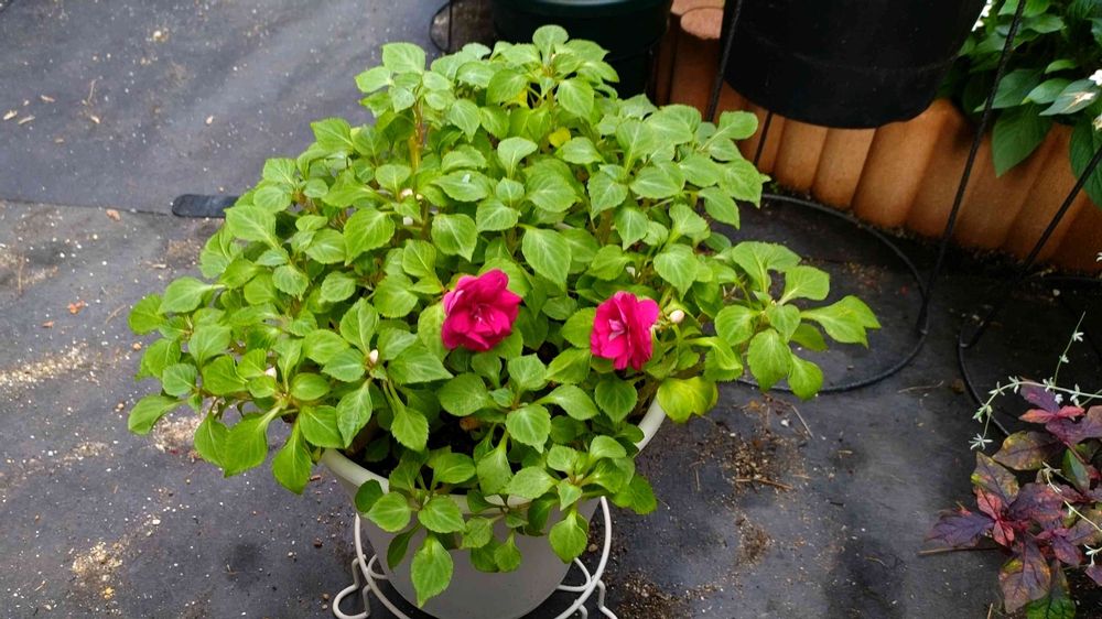 1ヶ月前にセール品で購入した、フィエスタ・バーガンディ(バラ咲き インパチェンス)です☺️