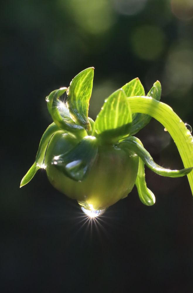 雨上がりの庭でダリアの蕾についた水滴が朝日に輝いていました。