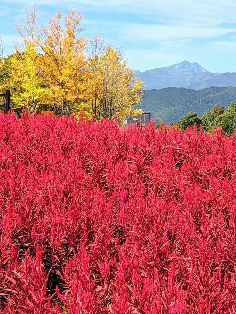 真っ赤なケイトウと黄色く色付き始めた木々と白山連峰を望む